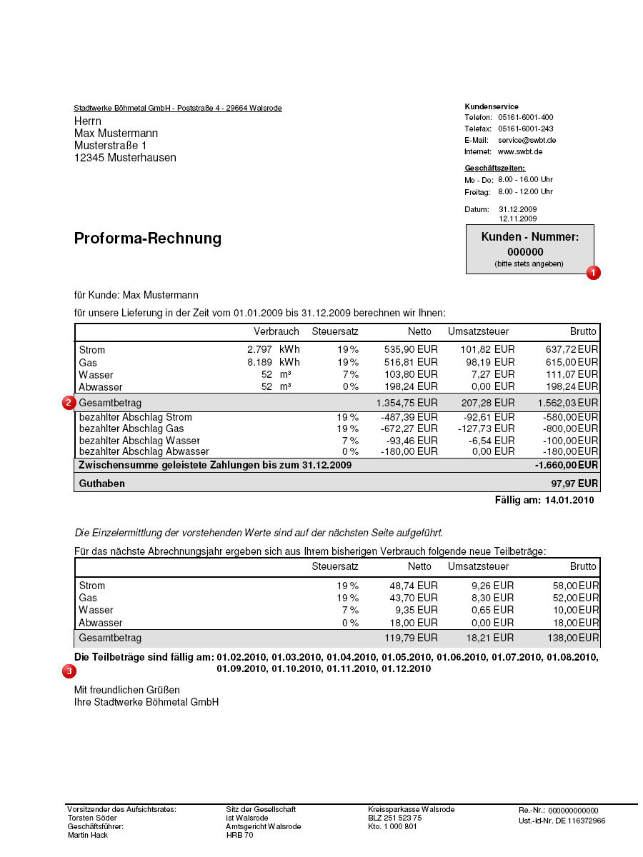 Dies ist die Gesamtübersicht Ihrer Verbräuche im Rechnungszeitraum für Strom, Gas, Wasser und Abwasser. Abzüglich Ihrer bereits geleisteten Zahlungen, ergibt sich ein zu zahlender Restbetrag bzw. ein Guthaben für diesen Abrechnungs- zeitraum. Rechnerisch ergibt sich bei einer Restforderung immer ein Minus-Zeichen vor dem Betrag.